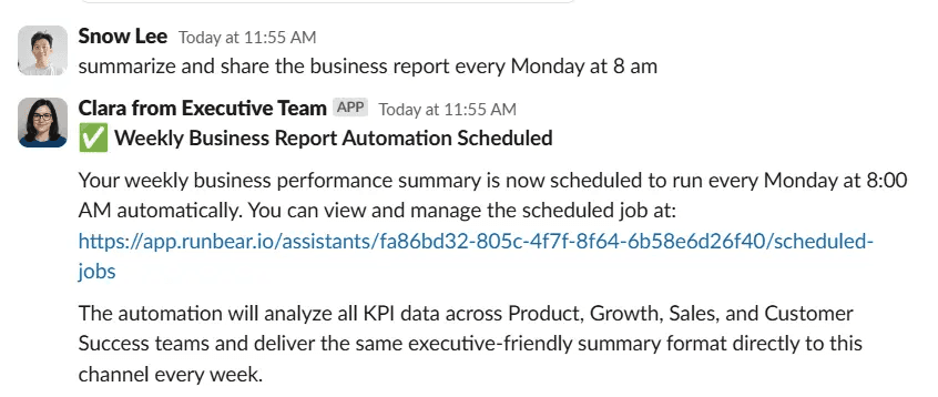 Your business data is powerful, but only if it’s timely. Runbear automates your analytics and delivers real-time insights, charts, and metrics right where your team works.
